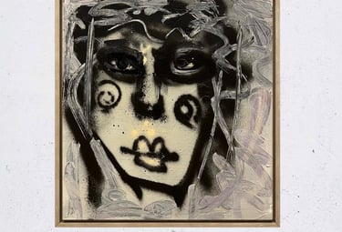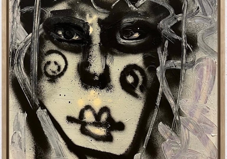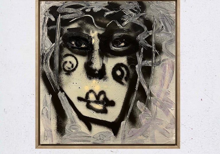 Aus der Tiefe des dunklen Acrylhintergrunds tritt die Figur mit roher Direktheit hervor. Schwarze Sprühfarbe formt das Gesicht, während Ölkreide es umspielt und aufbricht. Midnight Lady bewegt sich zwischen Figuration und Abstraktion – geheimnisvoll, intensiv und offen für eigene Deutungen.